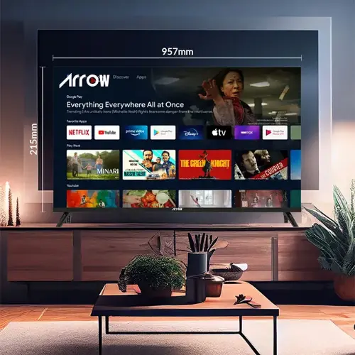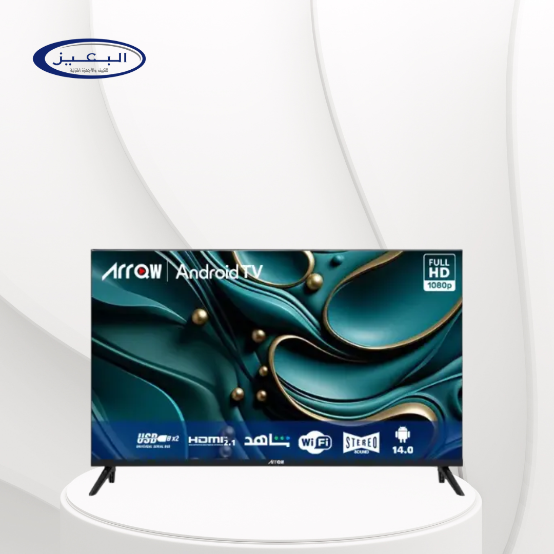 The 43-inch ARRQW Smart TV (model RO-43LPS) features a Full HD display with a resolution of 1920×1080 and a 16:9 aspect ratio, delivering sharp and immersive images. It runs on Android 14, providing a user-friendly smart TV experience. Enjoy high-quality stereo sound and take advantage of connectivity options with built-in Wi-Fi, two USB 2.0 ports, and two HDMI inputs, including HDMI 2.1 for high-speed connectivity.