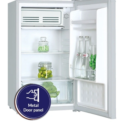 This stylish white mini-fridge offers a total capacity of 93 liters, with 83 liters dedicated to the refrigerator and 10 liters to the freezer. It features DEFROST cooling technology for efficient operation and easy maintenance. The unit includes LED lighting for bright, energy-efficient illumination. With a 7-year compressor warranty, it ensures long-lasting reliability. Measuring just 48 x 44.5 x 85 cm and weighing only 22 kg, it combines compact size with energy-efficient performance, making it an ideal choice for small spaces.