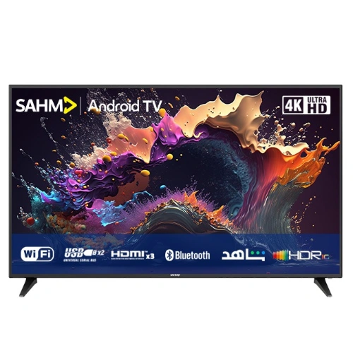 Exceptional visual clarity and an immersive experience. Discover the brilliance of the SAHM 58-inch Android HDR LED 4K TV. SHM-58LKGS. This state-of-the-art TV delivers stunning 4K UHD resolution of 3840 x 2160, providing unparalleled picture quality with exceptional detail and clarity. The LED display, combined with HDR technology, ensures vibrant colors and deep contrasts, bringing every scene to life. With a 58-inch screen size and a wide 89/89/89/89 viewing angle, enjoy an immersive viewing experience from any position in the room. A high brightness level of 240±20 nits/m² ensures clear visuals even in well-lit environments, enhancing the overall entertainment experience. Advanced Smart Features and Seamless Connectivity: The SAHM SHM-58LKGS Smart TV is equipped with Android 9.0, providing access to a wide range of apps and streaming services such as YouTube, Netflix, Miracast/Kindlelink, and the Google Play Store. The intuitive interface allows you to easily navigate and customize your viewing preferences. With three HDMI ports and two USB ports, connecting your favorite devices and peripherals is a breeze. The TV also features a headphone jack for private listening. Built-in Miracast functionality allows you to wirelessly mirror your screen from compatible devices, ensuring a seamless connection and hassle-free viewing experience.